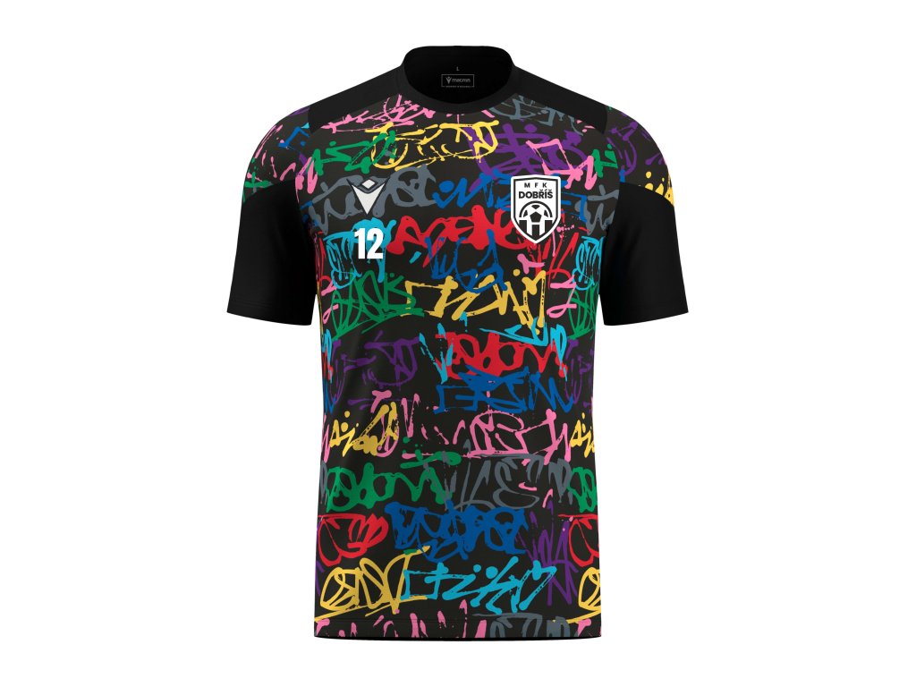Dominantním prvkem je celoplošný graffiti vzor, vytvořený sublimací pro maximální odolnost a stálost barev. Na srdci je umístěno oficiální logo MFK Dobříš, aplikované ve vysoké kvalitě, která odolá praní i dlouhodobému používání.⚽