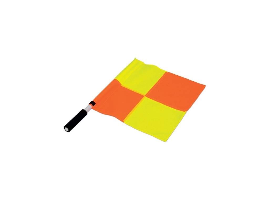 Referee Flag Sideline. Vlajka z polyesterové tkaniny (fluorescenční žlutý a oranžový vzor). Trubka z plastu SEP a rukojeť z kvalitní pěnové gumy. Disponuje otočnou funkcí. Rozměr: 50x50cm
