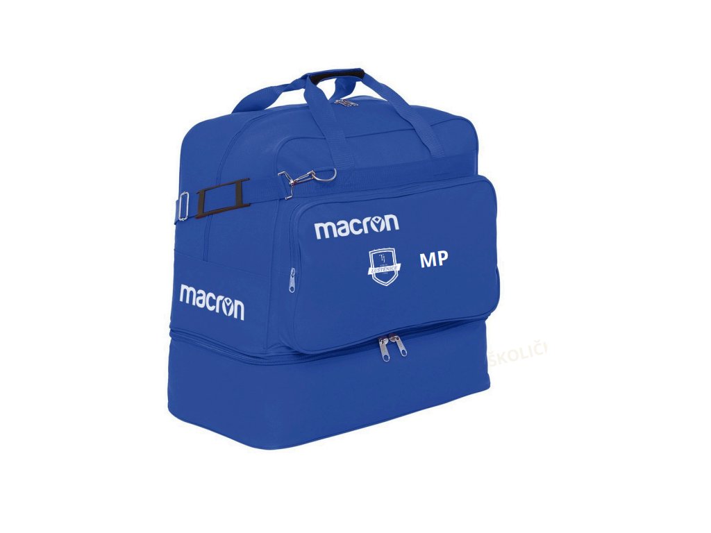 Praktická sportovní taška Macron Rocket v královské modré barvě s logem FK Všeradice a hráčským číslem. Nabízí objem 43 litrů, samostatný oddíl na obuv a pevný polyesterový...