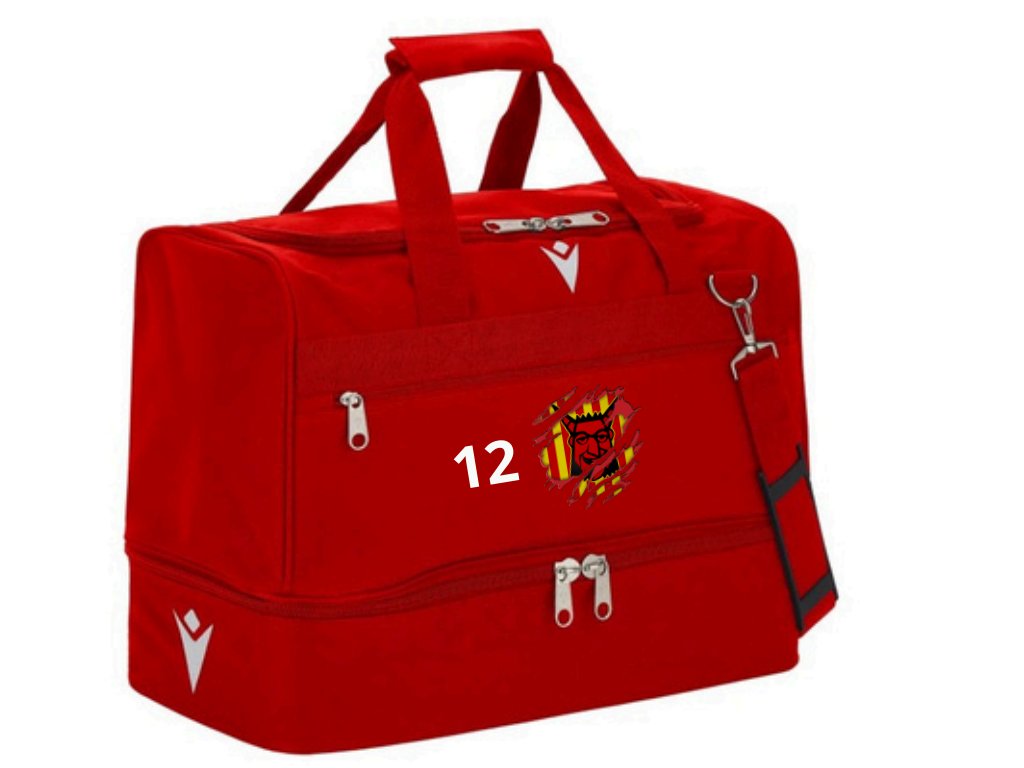 Taška má komfortní konstrukci s pevným dnem o výšce 14 cm, prostornou hlavní komoru a praktické kapsy pro organizační komfort. Na přední straně je umístěno klubové logo a hráčské číslo, což dodává tašce týmový a reprezentativní vzhled.