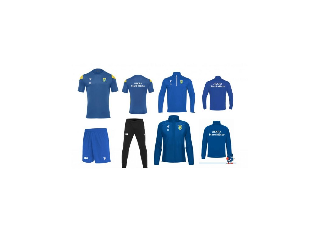 Všechny vrchní díly (dres, mikina, bunda) nesou logo klubu JISKRA Staré Město na srdci, doplněné o iniciály nebo číslo hráče pod logem Macron. Spodní díly (tepláky, trenky) mají iniciály nebo číslo umístěné decentně na stehně.