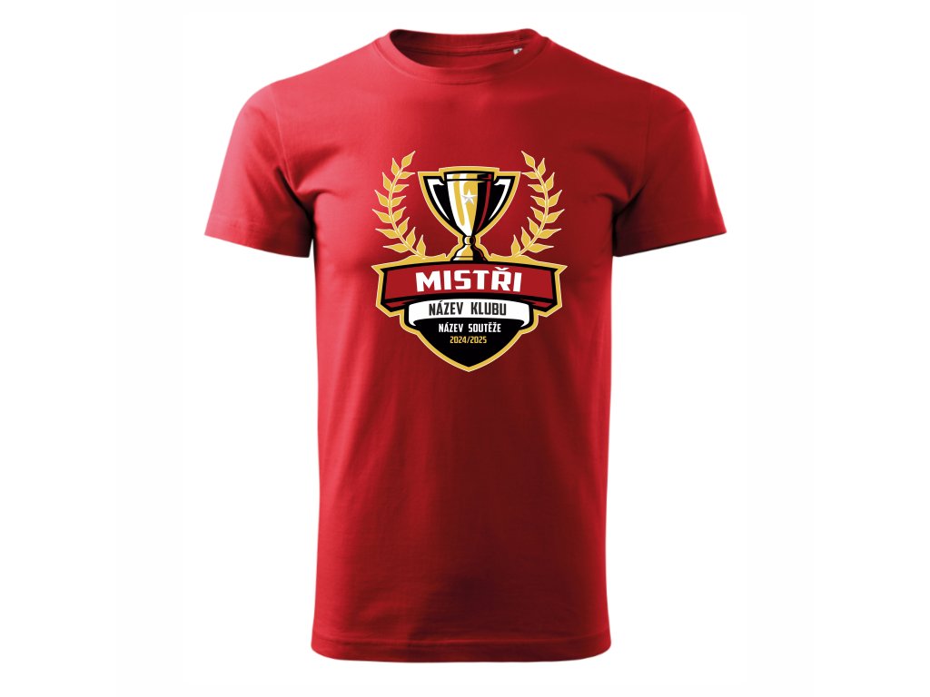 Stylový a odvážný potisk „MISTŘI“ s motivem trofeje a názvem soutěže