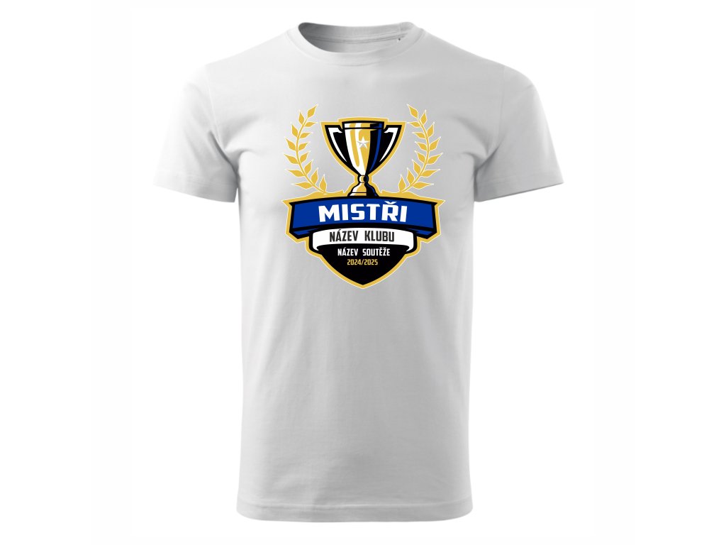 Stylový a odvážný potisk „MISTŘI“ s motivem trofeje a názvem soutěže